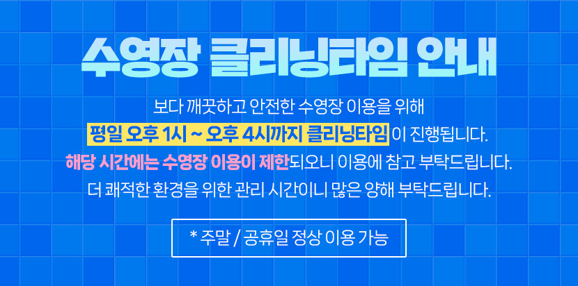 보다 깨끗하고 안전한 수영장 이용을 위해 평일 오후 1시 ~ 오후 4시까지 클리닝타임이 진행됩니다.