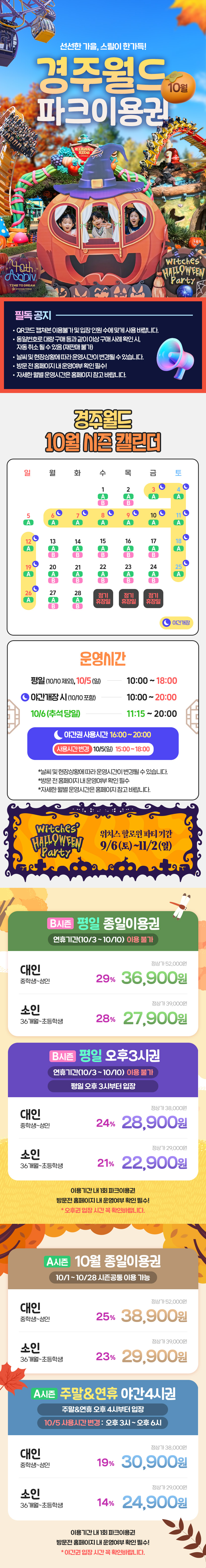 A시즌 야간4시권(연휴/주말): 10/1~10/28 기간 내 주말 오후 4시 입장(단, 5일은 오후 3시~오후 6시까지)