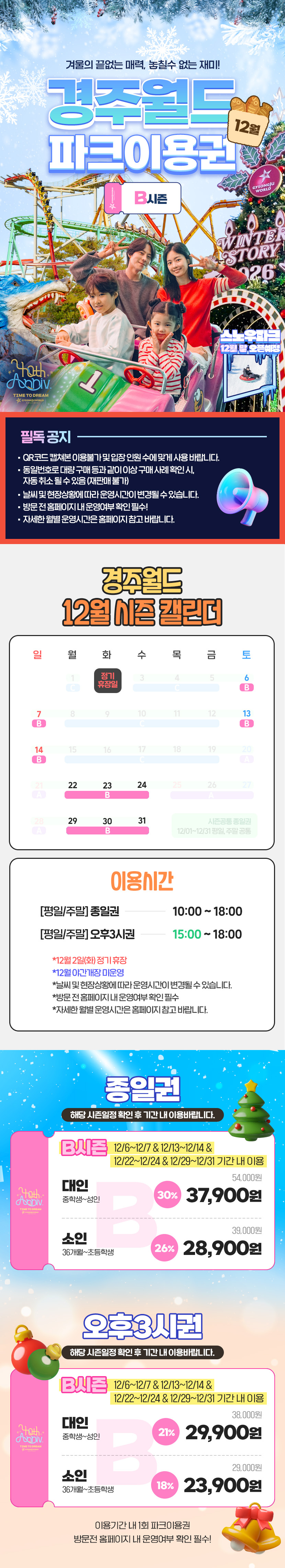 B시즌 종일권/오후 3시권: 12/6~12/14 기간 내 주말, 12/22~12/31 기간 내 평일(단, 12/25~26제외)