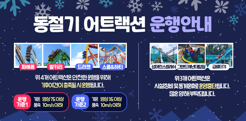 - 우천 또는 파크 사정상 예고 없이 어트랙션 운행이 중단될 수 있습니다.