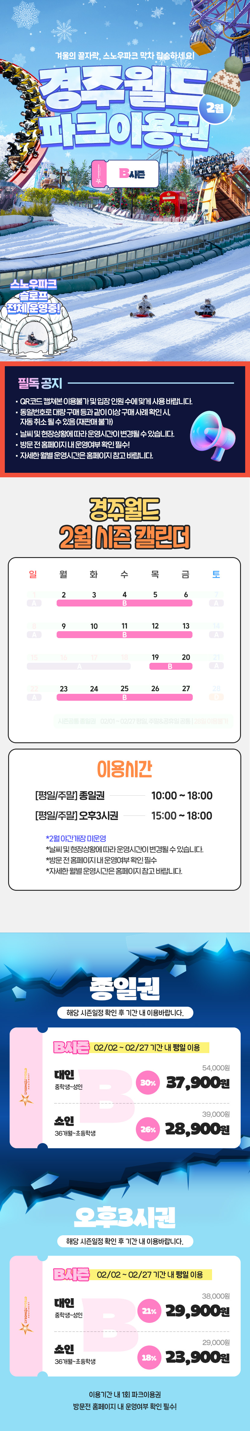 B시즌 종일권/오후 3시권: 2/2~2/27 평일 이용가능(주말/공휴일 이용불가)