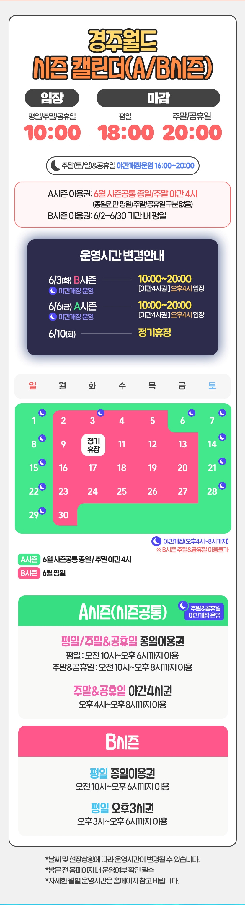 [경주월드 운영시간] 평일 10:00~18:00 주말&휴일 10:00~20:00(야간개장 운영) -6/10(화) 정기휴장 -6/3(화) B시즌 야간개장 운영(야간4시권 이용(3시권 사용불가)) -6/6(금) A시즌 야간개장 운영(야간4시권 이용) *평일 오후: 15:00~18:00(오후3시 입장) *주말&공휴일 오후: 16:00~20:00(야간개장 운영 시 오후4시 입장) *기상/현장 상황에 따라 운영이 변경될 수 있으니 홈페이지 참고 부탁드립니다. *결제 후 검표 가능시점까지 약20분 정도 소요됩니다 (결제 후 바로 입장불가하오니 사전 구매 부탁드립니다) -시즌별 이용일 반드시 확인 후 이용바랍니다. [시즌 옵션 안내] B시즌: 평일(6/2~6/30 기간 내 평일 이용) B시즌 오후권: 평일(6/2~6/30 기간 내 평일) 오후 3시입장(*6/3 오후 4시권 입장) 시즌공통 종일권: 6월 전체기간 이용가능 주말 야간4시권: 6월 주말&공휴일 오후4시~오후8시 ![]() |