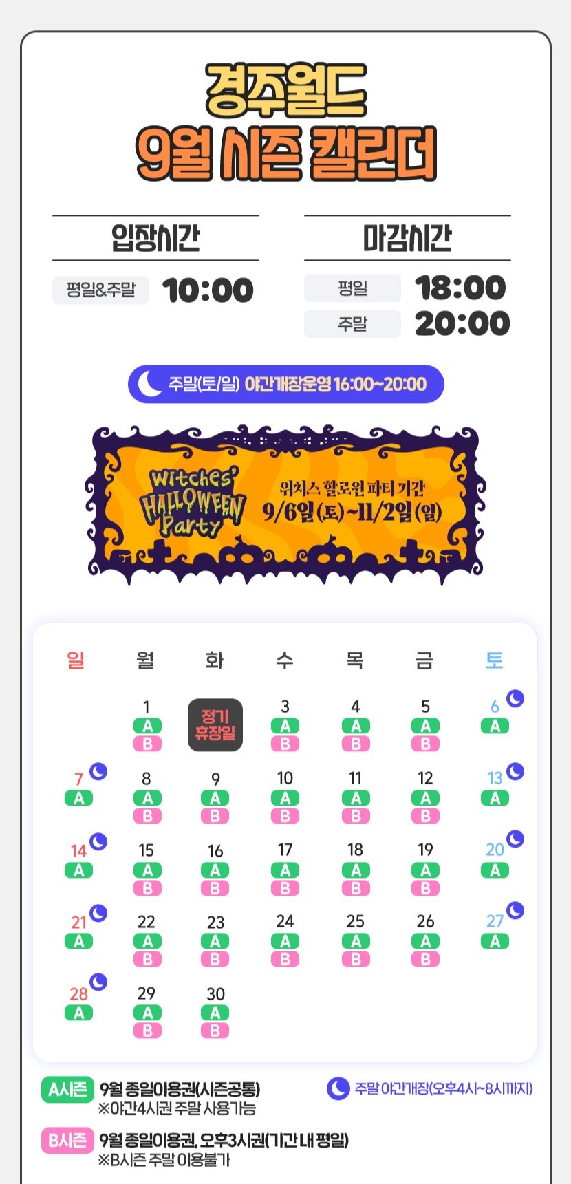[경주월드 운영시간] 평일: 10:00~18:00 주말&공휴일: 10:00~20:00 * 9/2 (화) 정기휴장일 *기상/현장 상황에 따라 운영이 변경될 수 있으니 홈페이지 참고 부탁드립니다. *결제 후 검표 가능시점까지 약20분 정도 소요됩니다 (결제 후 바로 입장불가하오니 사전 구매 부탁드립니다) -시즌별 이용일 반드시 확인 후 이용바랍니다. [시즌 옵션 안내] B시즌 종일권: 9/1~9/30 기간 내 평일 사용가능(A시즌으로 이용불가) B시즌 평일오후3시권: 9/1~9/30 기간 내 평일 오후 3시입장(A시즌으로 이용불가) A시즌 종일권: 9/1~9/30 기간 내 사용가능 A시즌 주말야간4시권: 9/1~9/30 기간 내 주말 오후 4시 입장