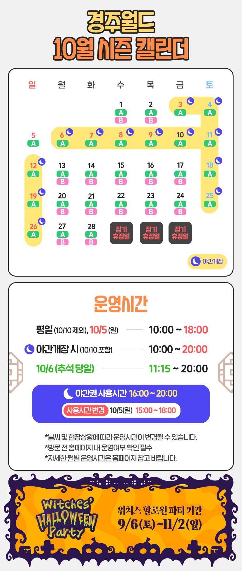 ★우천시 운영시간은 변동 될 수 있으니 이용 전 홈페이지 참고 부탁드립니다 ★10/29~11/1 정기 휴장일 [경주월드 운영시간] 평일: 10:00~18:00 주말&공휴일: 10:00~20:00 ★10/29~11/1 정기 휴장일 *10/5(일) 야간 미운영 *10/6(월) 11:15~20:00 *10/30(목),10/31(금) 정기 휴장일 * 9/6(토)~11/2(일) 위치스 할로윈 파티 기간 *기상/현장 상황에 따라 운영이 변경될 수 있으니 홈페이지 참고 부탁드립니다. *결제 후 검표 가능시점까지 약20분 정도 소요됩니다 (결제 후 바로 입장불가하오니 사전 구매 부탁드립니다) -시즌별 이용일 반드시 확인 후 이용바랍니다. -A시즌,B시즌 이용일 반드시 확인 후 이용바랍니다. -오후권 입장시간 상이 [시즌 옵션 안내] B시즌 종일권(평일): 10/1~10/28 기간 내 평일 사용가능(주말&연휴기간(3~10일) 이용불가) B시즌 평일오후3시권: 10/1~10/28 기간 내 평일 오후 3시입장(주말&연휴기간(3~10일) 이용불가) A시즌 종일권: 10/1~10/28 기간 내 사용가능(시즌공통) A시즌 야간4시권(연휴/주말): 10/1~10/28 기간 내 주말 오후 4시 입장(단, 5일은 오후 3시~오후 6시까지) ![]() |